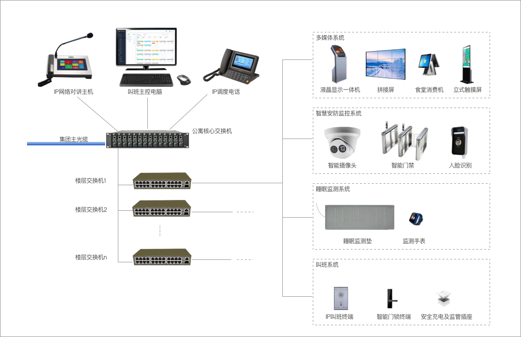 本公寓楼宇智能化即智慧公寓系统,包括智能公寓管理系统、智能公寓叫班及广播系统、多媒体子系统、门禁系统、睡眠监测系统等几大子系统。通过智能硬件和管控系统结合,实现服务性和舒适度的最大化。