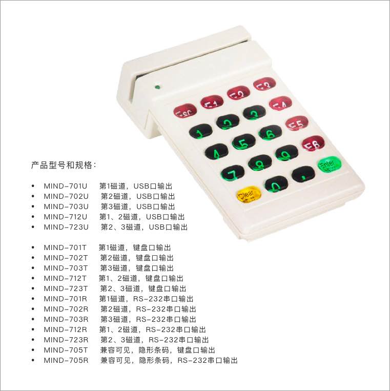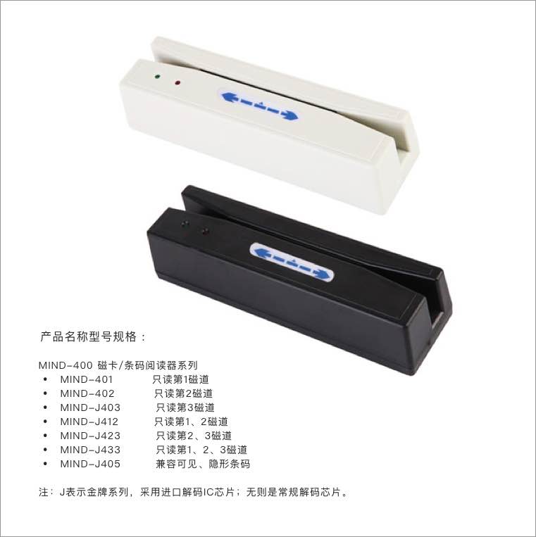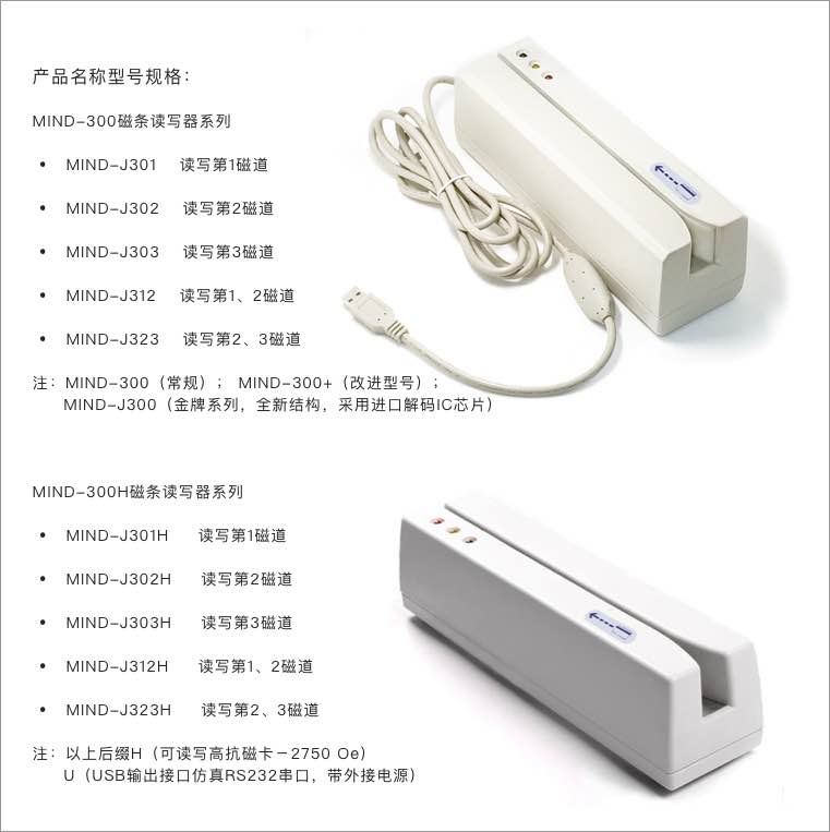 MIND-300系列型号规格:后缀H(可读写高抗磁卡-2750 Oe);U(USB输出接口仿真RS232串口,带外接电源)。后两位数字表示读写磁道。如:MIND-J323H 表示:高抗读写第2、3磁道。