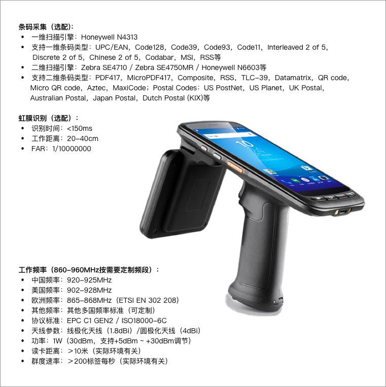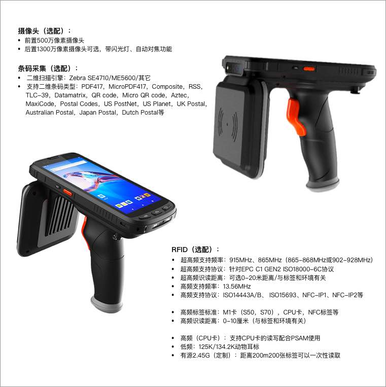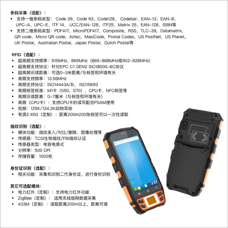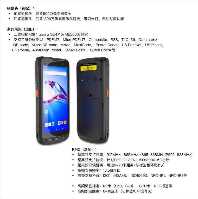 MD5000移动手持终端是一款集数据采集处理、RFID读写功能、指纹识别、身份证识别为一体的手持终端。广泛适用于:生产制造、服装盘点、仓储物流、警务巡检等场景。