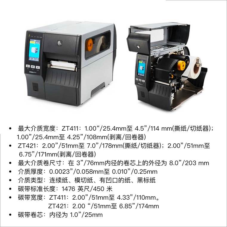 最大打印宽度:ZT411:4.09"/104mm。ZT421:6.6"/168mm
