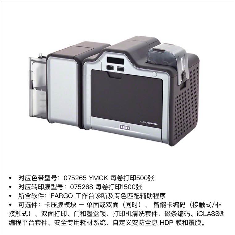 可接受卡片类型:具有光亮PVC表面的PVC或聚酯卡片;100%聚酯卡片需要单色树脂;具有PVC表面的光学存储卡;可重写卡片