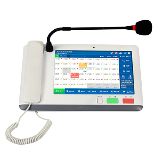 护士站主机安装于病区护士站,与其它医护呼叫系统设备连接,安全交互医护呼叫的信息,病人按下病床呼叫对讲分机时主机有相应提示,可实现多方对讲。