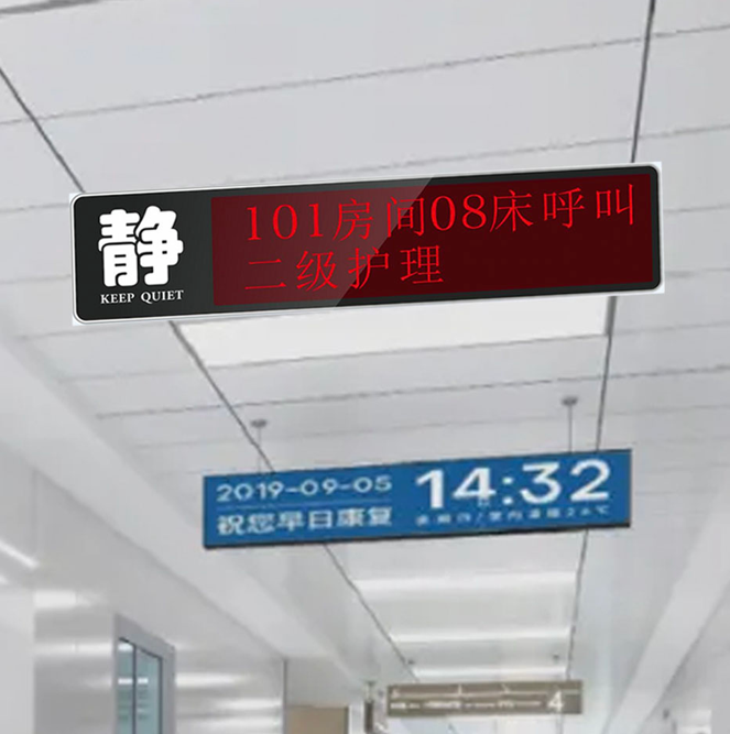 走廊屏安装于病区走廊、采用吊装方式安装,是一种双面显示屏,可显示房间号、床位号、呼叫顺序号、时间等,还可以自定义提示和公告,方便走廊的医护人员可以随时了解病人的当前情况。呼叫时,可循环显示护理级别、房间号和床位号,内置扬声器,支持同步语音报号。