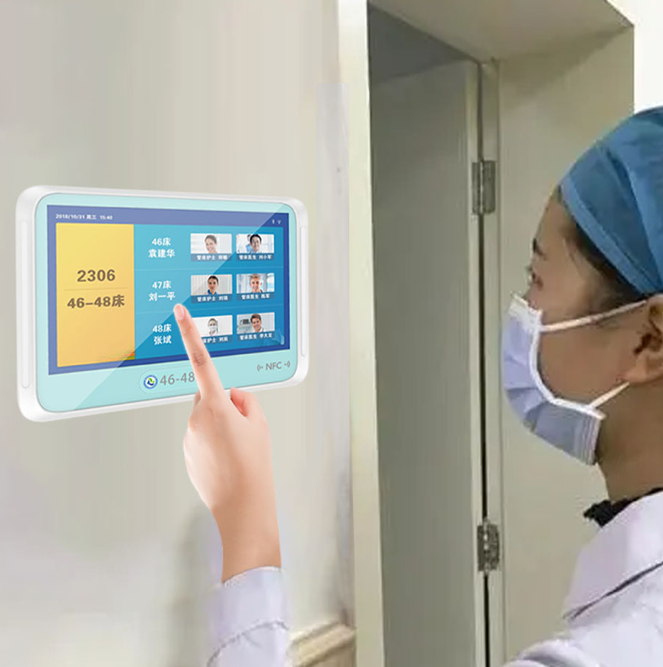 智能门口屏动态显示病房里每位患者的责任医生和责任护士的名字与照片,患者呼叫时,门口屏上也会出现相应的呼叫提醒(灯显示相应颜色),护士经过走廊时第一时间可以看到患者需求。