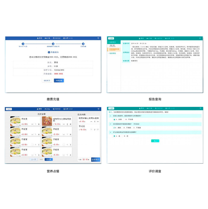 在现有以收费、临床为基础的医院信息框架下,床旁服务是专为患者使用医疗服务、生活服务、患者监护系统。通过深入挖掘临床业务流程、护理环节,为医护提供床旁查房、床旁护理等深度应用体验,为患者提供更优质的护理服务;通过床旁服务,患者可以进行快速信息查询、休闲娱乐、充值缴费,整体提升患者住院满意度。